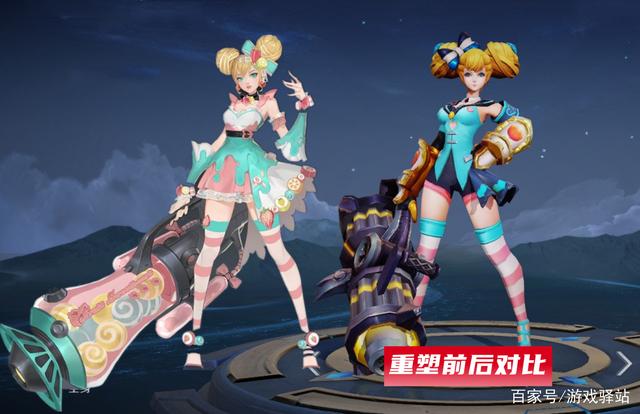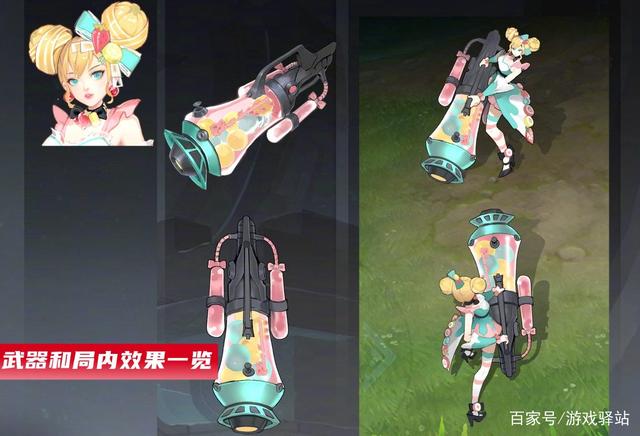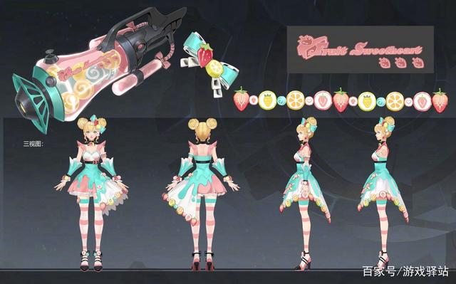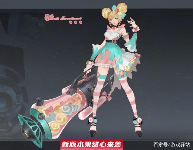 而变化最大的是配饰、护臂和武器,其中黄色水果包裹的丸子头让人眼前一亮,衣服加入了奶油滑落的图案,裙边新增了草莓、菠萝和橙子味的水果硬糖点缀,并且头饰的蝴蝶结也加入了橙子和草莓;护臂由原来的金属材质变成了水果糖装饰的布料,调整后使得整款皮肤看起来更加轻盈;最给力的是武器造型重做,变成了装满水果糖的粉色糖罐,虽说官方还没有公布局内特效情况,但通过该设计也能预知局内特效是发射各种形态和色彩的水果炮弹。