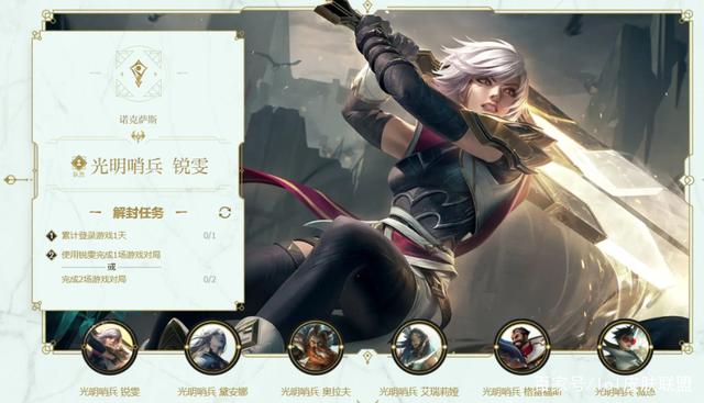以锐雯任务举例,完成任务需要两个条件,一个是累计登录游戏天数,一个是使用该英雄完成1局游戏或完成2场游戏对局,6位英雄完成任务的条件差不多,所以就不过多赘述啦,6位英雄分别是:锐雯,皎月,奥拉夫,刀妹,男枪,薇恩。
