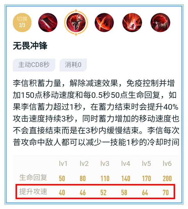 暗信的一技能的基础攻速加成从30%直接提高到了40%,这额外的10%攻速相当于让李信白捡了一把小匕首。同时,成长攻速也从每级5%提高到了每级6%,满级等于额外又获得5%的攻速。
