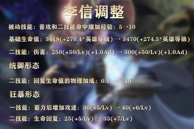 这次的增强主要是提高李信的生存能力,基础和成长生命值的提高聊胜于无,光信和暗信分别获得了二技能恢复能力的提高。但是,光信的问题并非生存能力,而是伤害大幅度缩水,无法获得实质性的增强。暗信在生存能力提高之外,额外提高了一技能的攻速,对他的帮助非常大。