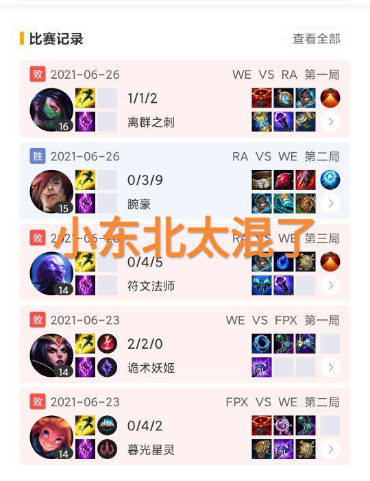 在面对ra战队的对抗中,we战队再次出现了很严重的问题,中单的小东北尤为明显。在三局比赛中,他分别使用了瑞兹,劲夫和阿卡丽,阿卡丽那一局就不说了,因为队友崩盘导致争取的节奏很难带。第二局的获胜和他的关系又不大,我感觉中单劲夫小东北其实并不会玩,无论是开团还是进场的时机都掌握不好。最关键的决胜局,他拿到了瑞兹,而这场比赛也成为了职业生涯最惨的一场,每一个操作都是明场面。