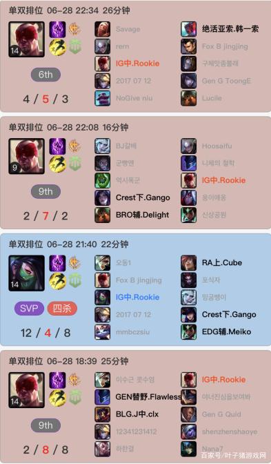 现版本盲僧的优先级很高,Doinb、Scout本赛季都曾多次用盲僧来帮助队友打出更好的团战配合。然而Rookie近期的Rank记录中却依然是以阿卡丽、瑞兹、卢锡安为主,掏了几场盲僧效果都并不好,后续的比赛BP依然会是问题。