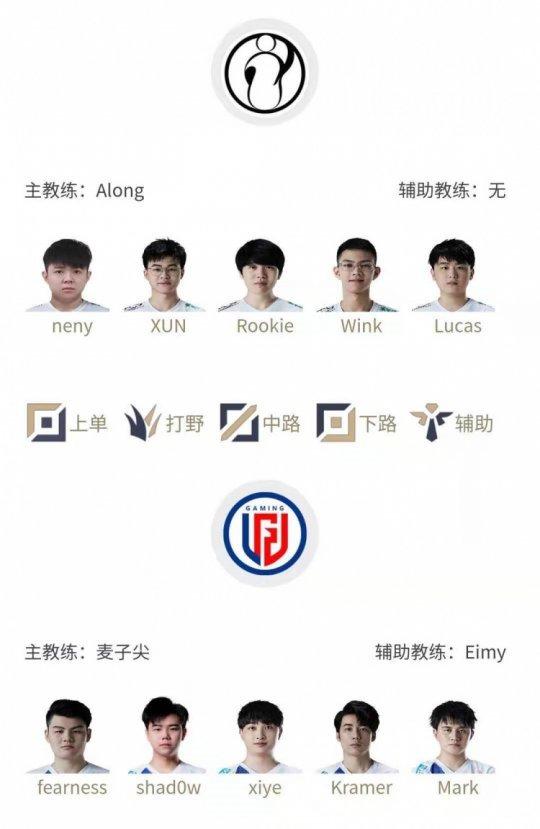 iG:上单neny、打野XUN、中单Rookie、下路Wink、辅助Lucas