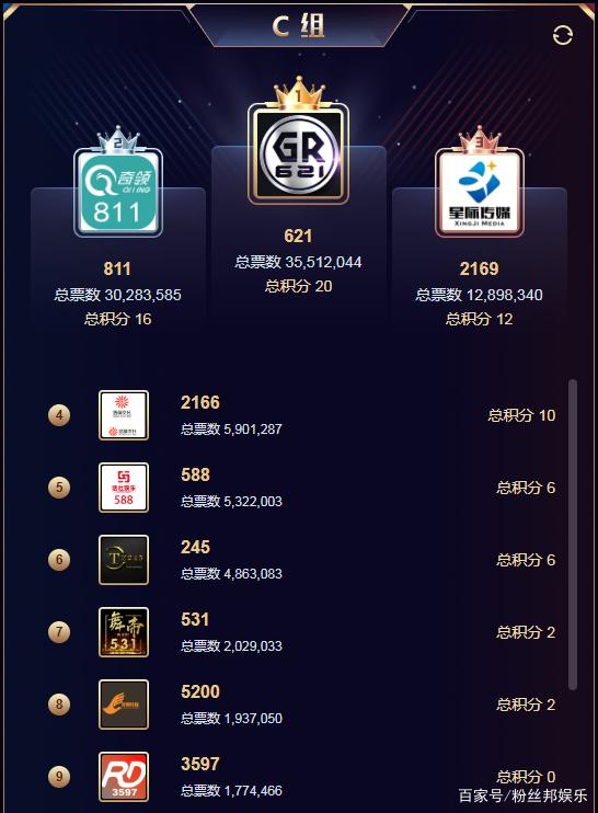 以“巅峰赛区”为例,积分赛第一轮A、B、C、D四个分组均拉票破千万票,其中心悦、华矩、文儿951更是首日就突破3000万票。