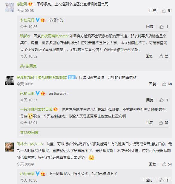 6月29日,《永劫无间》官博发布了一则关于打击外挂店铺的公告,评论区一片叫好。然而更多的却是玩家们询问“单行开挂事件”的结果,甚至许多评论都是高赞。但是有趣的是,《永劫无间》官博却选择选无视了这些评论,反而是回复了一些点赞少的评论,这就有那么点控评的意味了。