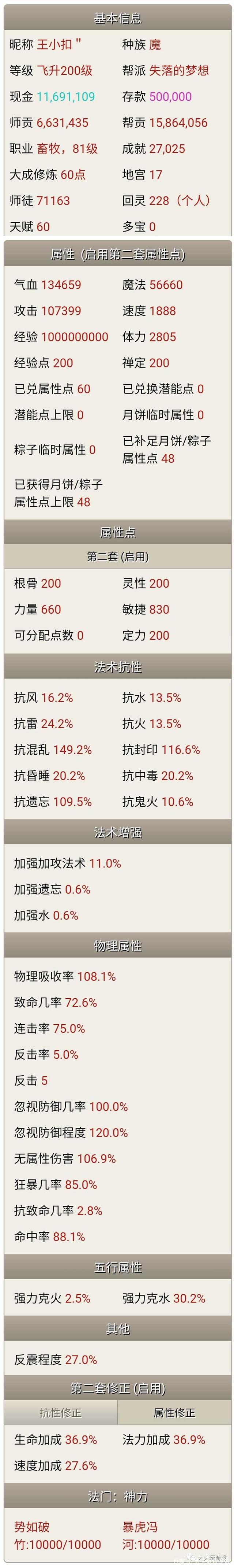 真想知道一下,这个破魔是怎么玩到这么极品的,先不别说的,敏1888,攻10W,一般平民的攻也达不到10W,平民的敏魔手都出不了就被砍死了,双破都过100,更加牛的是双法门10000,这就不是平常人能做到的,猜猜这个号能要价几W呢?