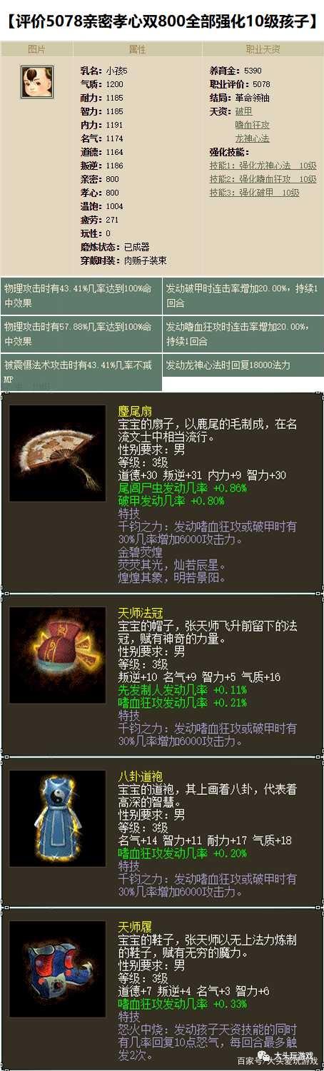有Nb的属性,当然的有Nb的孩子了,这是个成品评价5078,亲密孝心双满800,天资更是达到强化10级,嗜血狂攻和破甲一起更是达到了100过,抗震慑魔法达到43。以前的可以说人物出手孩子必叫,鬼有多少躲闪都是闲的。