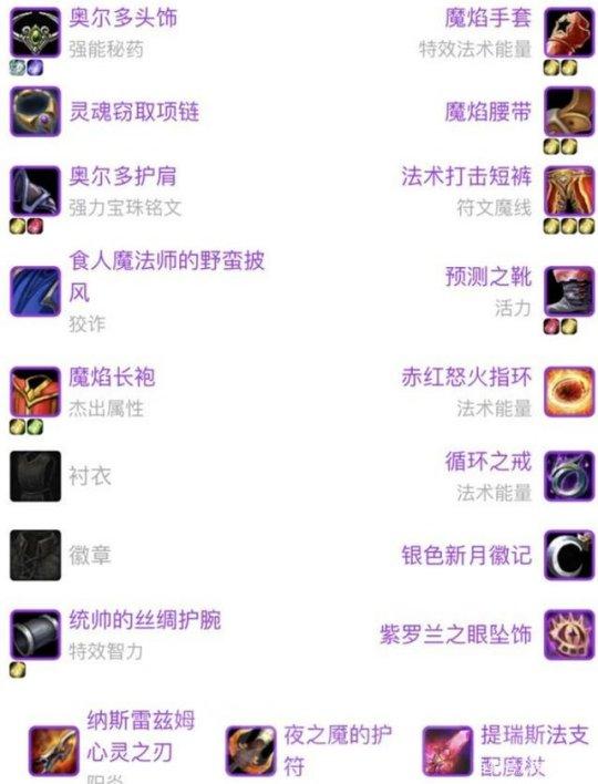 当然,在一些可预见的、时间较短的战斗中,奥冲大可以多打一两次,来保证更高的输出,长时间战斗如格鲁尔和玛瑟里顿就要考虑到蓝耗了。以目前法师的回蓝手段(上面说的3种)和BOSS战时间,蓝量完全够用,这里都没算智慧审判和暗牧回蓝。配装方面大家看图,这是P1阶段理论毕业配装,也可以用一些蓝装来下位替换。选择魔焰套是因为,奥冲法爷的主要伤害都来自奥冲,冰箭一般占比不超过30%(超过了就是你没玩好啦),魔焰加奥术伤害不加冰伤。