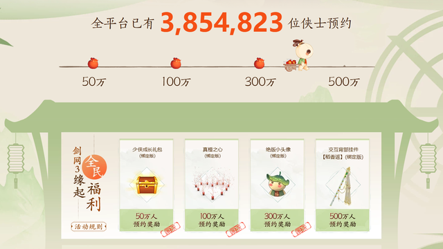 答:有,而且还不少!截至当前,《剑网3缘起》的预约人数已突破了385万之多。抽出几分钟的时间便可白蹭数个福利,如少侠成长包、拉风挂件等等。