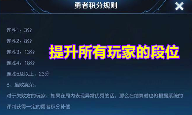 勇者积分也并不是说就可以把一个玩家从钻石段位给拖掉荣耀王者,这是不可能的事情,勇者积分我们可以理解为帮助所有的玩家提升一个段位的机制,所有的玩家都可以享受勇者积分的不掉星机制,就算你实力非常强大,但除非你百分百胜率,不然勇者积分就会帮你上分,但不是质的提升,而是下限的提升,比如你之前一直都是一个钻石段位的玩家,那么有了勇者积分以后你可以打到最强王者,就是这么一个概念。