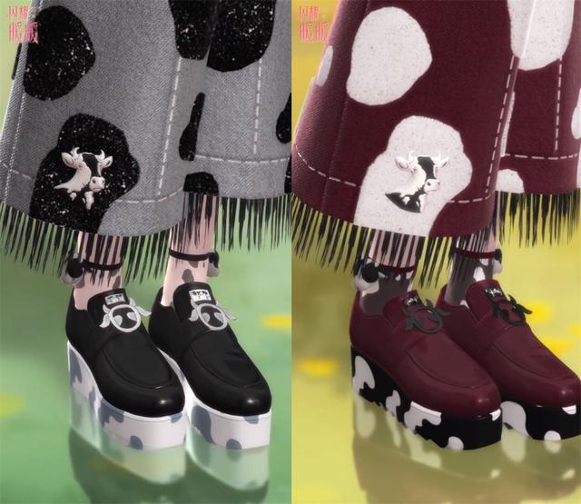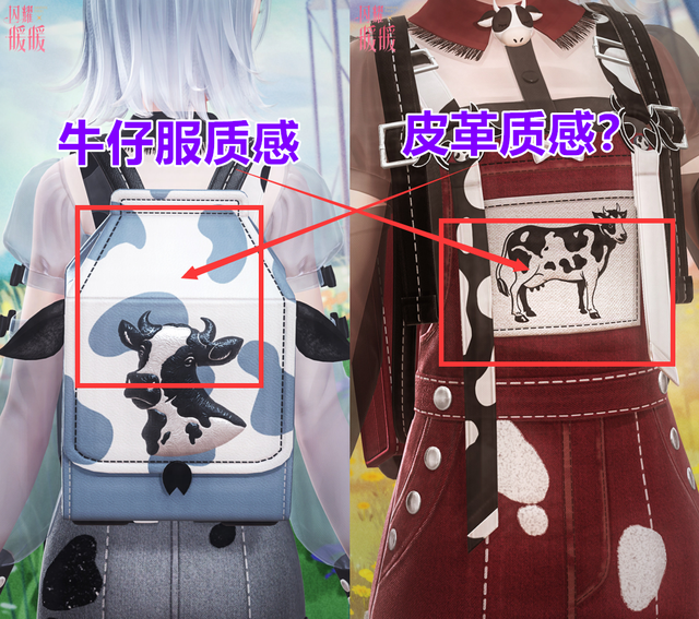 虽然是奶牛主题的服装,但这一套却并未由黑白色占据主导地位,相反灰色与天蓝色才是主C位。天蓝色小然我觉得应该是呼应盛夏的设计点,毕竟除此之外其他细节完全找不到与夏日的关联......复苏后的大红色不但与原版有着强烈的设计反差,结合狗叠强烈暗示的背景,能让小伙伴们秒懂复苏后的颜色象征着黄昏,颇有一种夕阳西下的牧场少女之感觉?