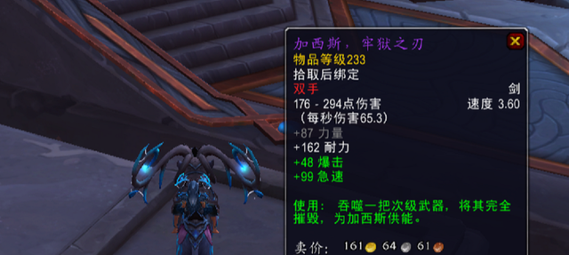 前些天给大家介绍了9.1掉落的一把新武器,名字叫“加西亚,牢狱之刃”。这是一把由9.1最新团队副本“统御圣所”的倒数第二个Boss克尔苏加德掉落的双手武器。