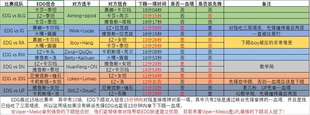 据统计,目前EDG一共进行了15场比赛,其中有10场EDG下路双人组在15分钟内对线拿到了对面一塔,而这10场比赛中,只有两场是依靠峡谷先锋拿到的一血塔。这样的数据有多么恐怖?意味着Viper与Meiko的下路组合有着高达67%的爆线率,15分钟内就可以拿到一塔,可以帮助其他路也得到优势。不得不让人惊讶,目前EDG的下路双人组进攻型是那么的恐怖如斯。