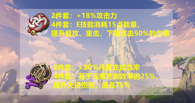 首先是针对“普攻技能”的“追忆”套圣遗物:2件套增加18%的攻击力,4件套施放E技能时消耗15点能量,提升50%的普攻、重击、下落攻击伤害,持续10秒。2件套效果可以替代角斗士,4件套效果适用于以普攻、重击、下落攻击作为主要攻击手段的角色,比如说主C菲谢尔、宵宫,甚至是神里也可以使用,而像可莉、甘雨(非辅助)这类对大招需求不高的角色也可以使用。