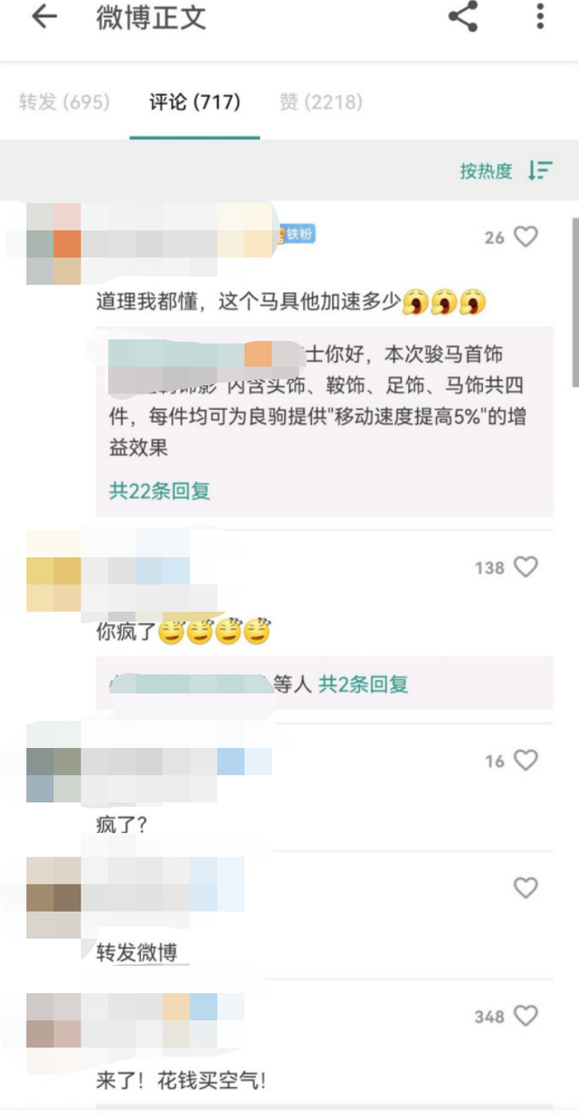 反正我傻眼了,我从没这么清晰地认识到给西山居送钱的我是这么NT,你是不是穷疯了啊?而且就拿你官博发言,口口声声说着新马具四件都有移速加成,每个加成5%,难道真就是策划不玩游戏了?说好的属性不进商城呢?现在有忽然改口了,只有三件,马饰又不加了,再配上这个离谱的价格,我只想问问你,西山居你这是第几次试探玩家底线了?