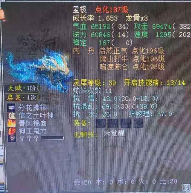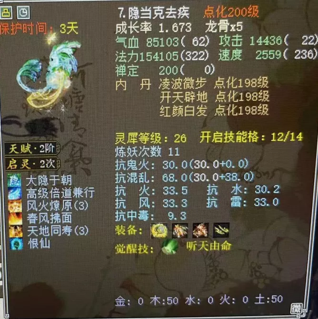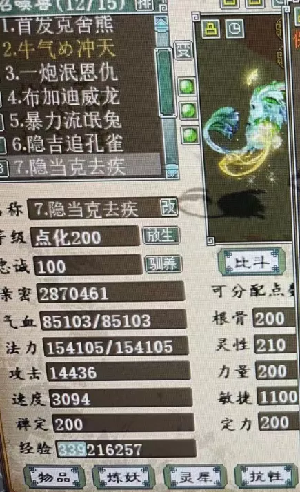 这是一只点化200级的去疾,287万的亲密度,速度达到了3094,对于去疾来说有这样高的速度确实是非常吸人眼球的,首先去疾的初值是主法力,辅速度,速度的初值比较低。实际初敏210可以达到3094的速度确实不容易。