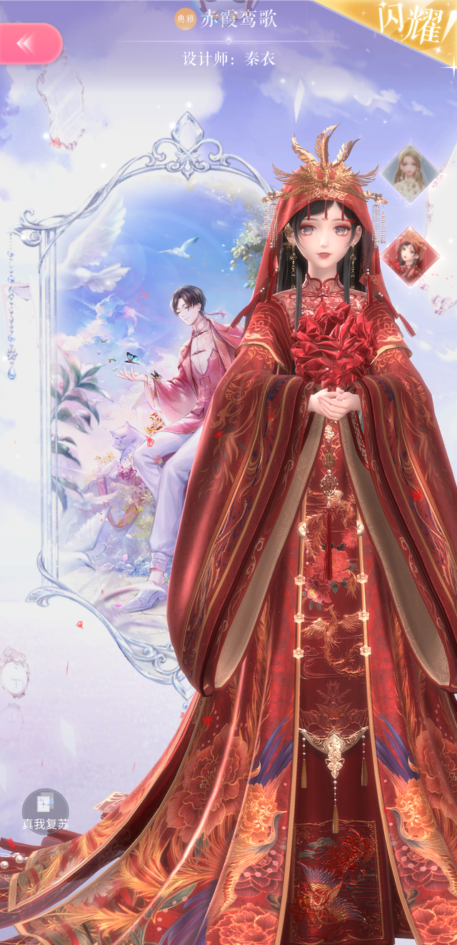 网上很多玩家都会用“原野之秋”这背景去配一套红色的衣服,效果还意外地不错。这套红色的衣服在游戏的活动中产出,而且是一套闪耀级别的时装,名为“赤霞鸾歌”。