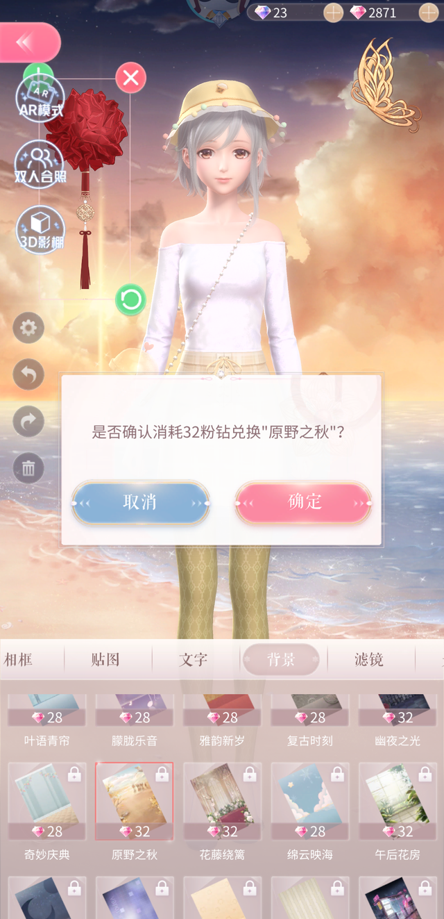 这张名为“原野之秋”的背景图可以在拍照时使用,如果你在特定的活动中没有来得及获得,没关系,你可以直接用32个粉钻兑换,再说,这张背景绝对物有所值。