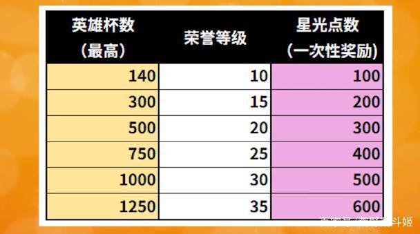 另外还有英雄杯数达到一定数量后,会解锁一次性的星光点奖励,荒姐把表格放在下面,宝贝儿们记得看仔细哦~