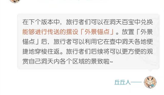 而旅行者们一直非常期待的“种植”系统也给了答复,说开发组已经在准备相应的玩法了,让旅行者们期待前瞻特别节目(等同于什么都没说,只是告诉你们未来确实有这个玩法)。这样看下来的话,尘歌壶最有用的就是下个版本中能通过洞天百宝兑换放置的“外景锚点”,能实现洞天岛屿的传送,就是不知道会不会也是限时的,如果和口袋锚点一样限时策划就可以直接原地升天谢罪了。
