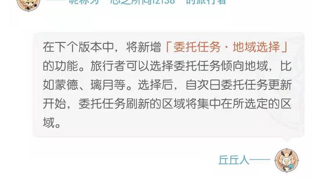 有一个功能看似有些鸡肋但确实有些用,但你要说它有用吧又真没什么正经用处。在下个版本中,旅行者们将可以自行选择日常委托的倾向地域,说白了就是你可以指定每日委托刷新在蒙德还是璃月了,这个暂时确实没什么用,就那么大点地图,自己找找就出来了,不过未来开的图多了还是很有用的,能省不少的麻烦事。