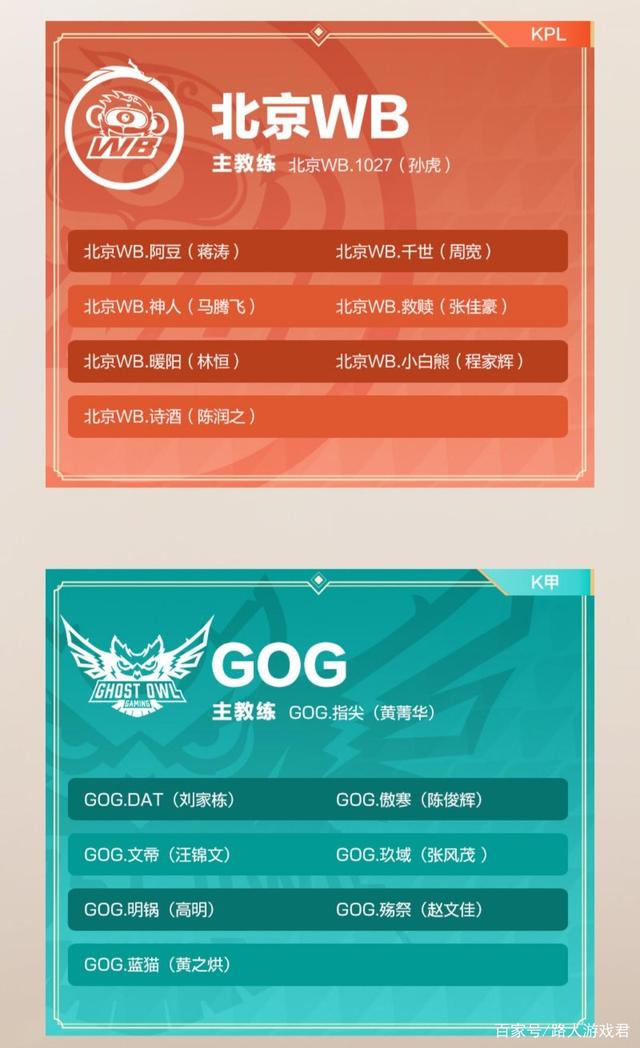 GOG大名单,Dat超级对抗路,蓝猫次级最秀露娜,文帝,明锅和傲寒首发五人组,今年的次级冠军五人组,替补玖域和殇祭,主教练指尖(kpl退役的老选手)