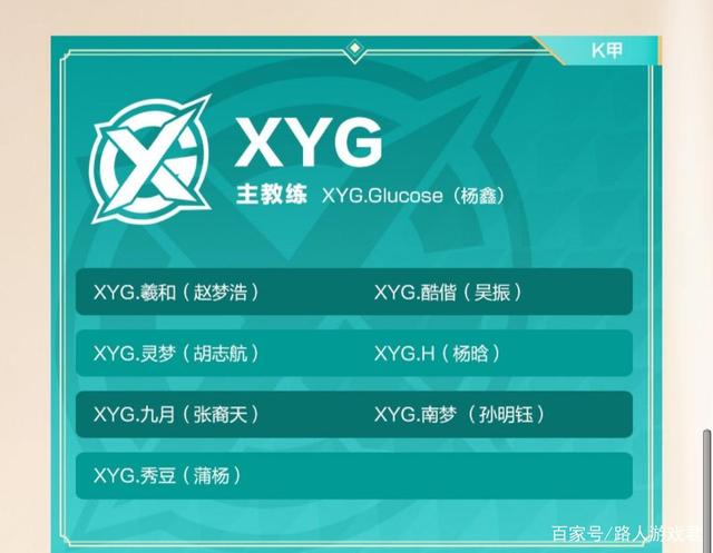 XYG大名单,对抗路酷偕,中单灵梦,打野九月,射手秀豆,辅助羲和,这就是固定的首发五人组。替补选手有H和南梦,主教练Glucose(记得以前教练不是这个,好想是换了)