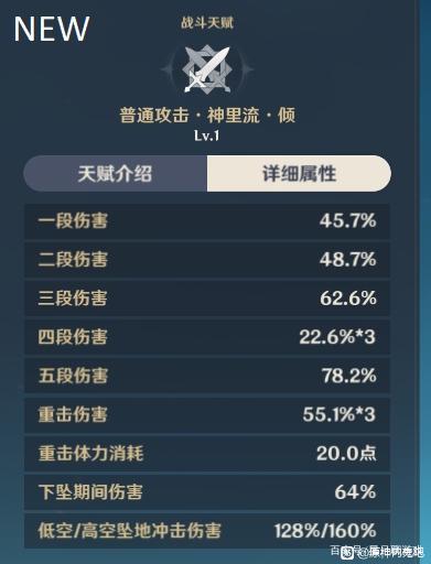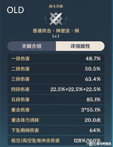 首先是普攻,从下面2图我们可以看出神里的普攻一到三段都进行了削弱,而第四段基本也等于未被增强,重击的面板百分比则不变。由此看出改动后米哈游是希望大家更多打重击,因故削弱了普攻的百分比。而为何要这么改,这就得提到6命效果的整个变化了。