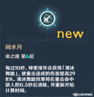 可以看到原先6命的效果为神里的冰元素伤害造成暴击后3秒内,神里的伤害提升10%,最多可以触发5次,每0.1秒只能触发一次。即通过附魔后的普攻或者E技能,大招等都能增加伤害,最高伤害提升50%。而可能策划觉得6命提升并不是太明显,因此改成新的10秒一次超级强化重击效果。原先神里升级普攻后,10级的重击效果为147.43%*3,而满命后则可以做到10秒一次445.43%*3的重击效果,总计1336.29倍率,堪称10秒的一次核弹怪了。