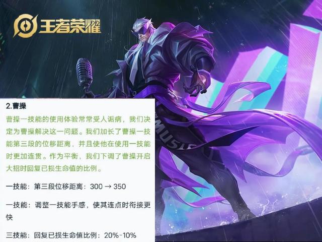 那么此次官方也是看到了曹操这个英雄,希望能够把他从冷门行列当中摘出来,那么此次调整了曹操的一技能的第三段位移距离从300码调整到350码。同时还调整了一技能的释放手感。
