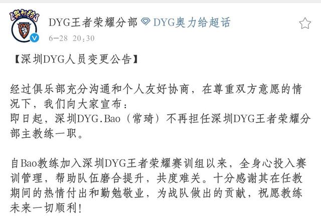 这回数DYG变动最大了,Bao教练宣布下线,在官博已经发出消息,DYG全员给出最真挚的祝福,其实bao教练在DYG还算是比较尽职尽责的,虽然比不上之前的林教练和SK教练,但是联赛中的顶级教练不就是那么几个吗,不可能以顶级教练的要求去要求其他教练吧。