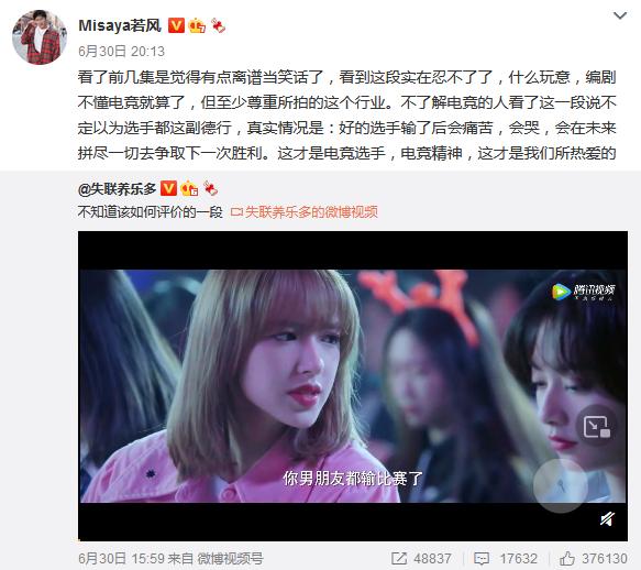 若风表示:这部电视剧就当个笑话看,但是最近实在看不下去了,不懂电竞就算了,最起码要尊重这个行业,不了解这个行业的人看了还以为选手都是这个德行。