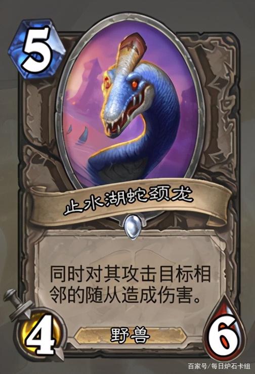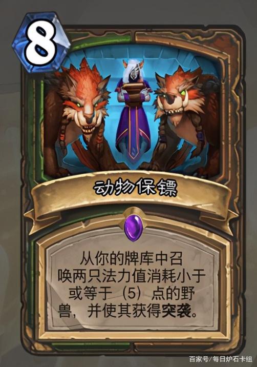 这两张卡分别对应我们面对不同对手,如果面对快攻这时候我们的场面压力可能已经满大的了,这时候就需要随从来站场解场,拍动物保镖把止水胡龙颈蛇给拉出来,配合上突袭完全可以解掉对面的小怪,就算是拉出夜行虎或者是厚皮科多兽,也能在一定程度上缓解我们的场面压力。