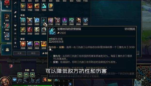 我们先来看看厌恨锁链的装备效果,增加650点血量和20%的CD这就很常见了,肉装一般如此。它的主动-起誓,可以让你在无限距离选中敌方一名英雄,然后在60秒内积攒【复仇令】,每一层的【复仇令】可以让你免受1%来自敌方的伤害,最高可免30%,当【复仇令】满层时,仇敌在周围可降低其20%的韧性。