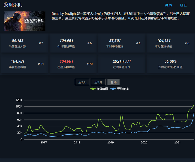昨日(7月1日),《黎明杀机》游戏5周年限时活动正式开启。早前,《黎明杀机》联动《生化危机》的DLC,当时游戏同时在线的玩家达到了94855人。本次活动的玩家同时在线数再创新高,超越《生化危机》联动,高达104981人。