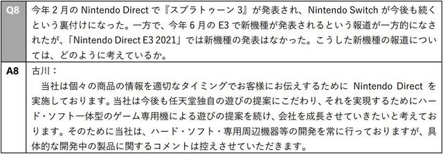 古川俊太郎在回答股东提问时表示任天堂将继续专注于制作度独特的游戏,为了实现这个目的,任天堂也将继续采取硬件与软件一体的游戏专用主机游玩游戏的方针。任天堂一直在不断开发硬件、软件与周边设备,但是并不会对正在开发的特定产品发表评论。