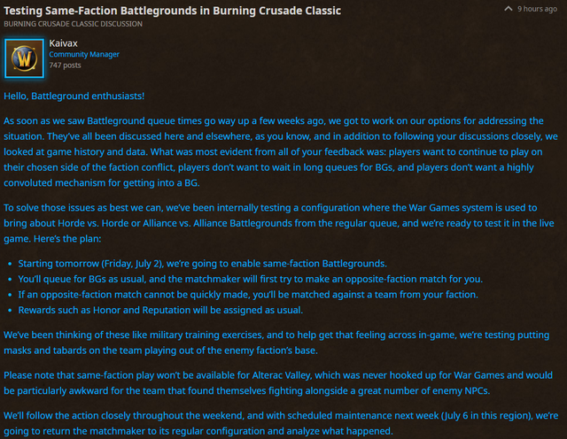 当然暴雪爸爸对亲儿子的诉求怎么能置之不理呢?而且部落玩家动辄排队一两个小时确实是事实,因此暴雪终于公布了一份正式蓝贴,宣布临时开放“同阵营战场”系统,蓝贴内容如下。