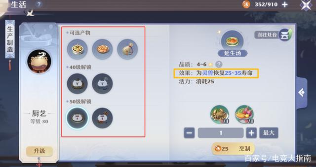 做好佳肴,这些菜品(四喜丸)不仅可以补充气血值,(芙蓉虾)还可以补齐法力值,就连百花酿也能恢复技能怒气值,做菜的厨艺越高,菜品能增益的buff效果更多,有的还能为灵兽恢复寿命值。