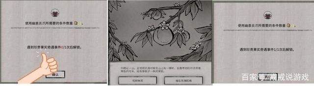 天赋盘的任务有些是玩家平时在大地图里遇到的奇遇,比如这个“遇到珍贵果实奇遇事件”,就是在大地图走的时候路过一山,正觉得饥渴的时候看见山上有一棵树,长着枣树的叶子开着黄色的花朵,结有像桃子一样的果实,然后玩家选择吃掉果实就好了。还有的玩家说:“复仇那个才X蛋,故意挑衅都没人反抗。而且NPC密谋半天没人敢复仇,故意重伤半血被复仇打赢了还不算。最后在重伤的buff下偷窃被打才成功。最后解除本命器灵,结果天赋又没了,还要重新复仇解锁。”