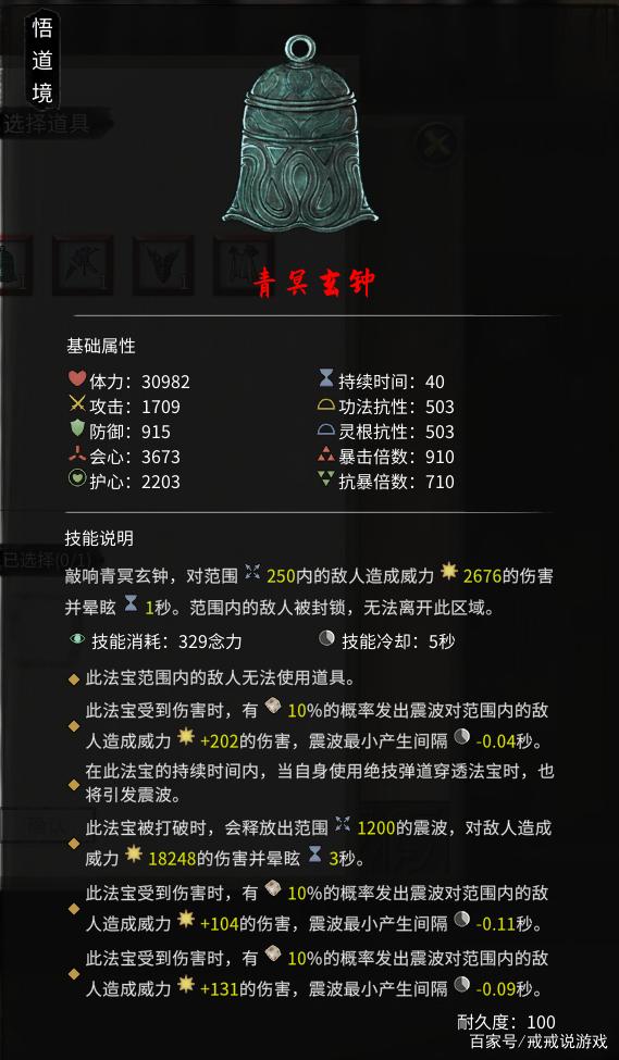 很多玩家在刷器灵的时候都忽略了法宝,法宝的玩法也是很多的,它们有着各自的基础属性和技能,如果用的好了可以让你打起来更有战斗力。比如青冥玄钟的技能就是限制敌人的移动,让它无法离开固定区域,并且受到伤害的时候会产生震荡波,如果用得好的话也会很强。下一篇文章戒戒会介绍几个法宝的用法和特点,你期待吗?