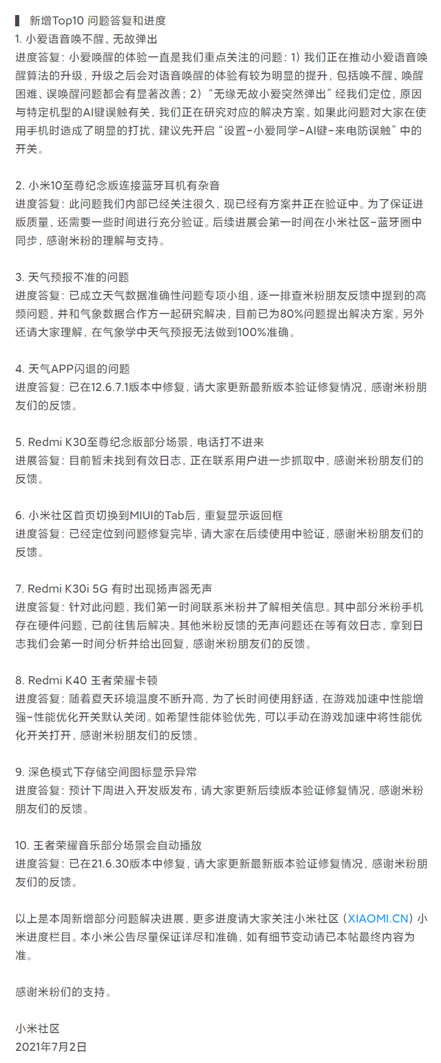 关于天气预报不准的问题,小米已经成立专项小组,逐一排查米粉反馈的高频问题,并和气象数据合作方一起研究解决。