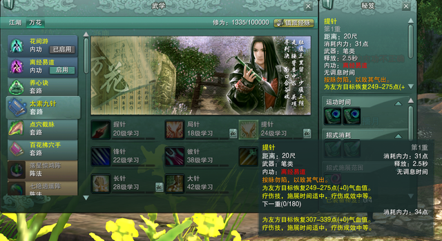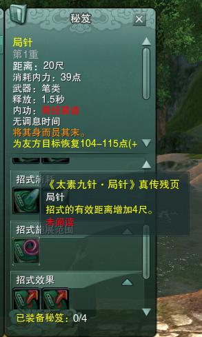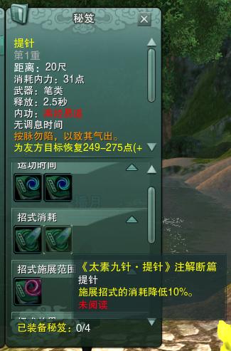 秘籍选择:有着与提针一样的问题,需要在减少读条时间与治疗量之间做取舍。另外由于长针消耗内力较多,减少招式消耗的秘籍是需要考虑点上的。