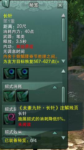 减少招式消耗:注解残页,招式消耗减少5%,49级任务真相获取;注解断篇,招式消耗减少10%,阅读书信辑录其二·邀药王入谷书。