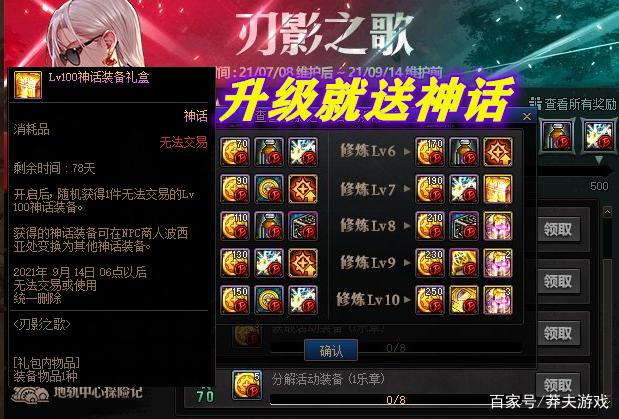 2、刃影成长修炼记,升到满级保底可拿6个神话转换石。