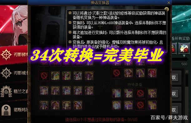 那怎么办呢?这就只能靠“神话转换器”了,每转换一次就能剔除一件神话,总共有35件随机神话,那么也就是说,我们以最黑的玩家为例,如果能拿到34个转换石,就必定能拿到最后一件指定神话!