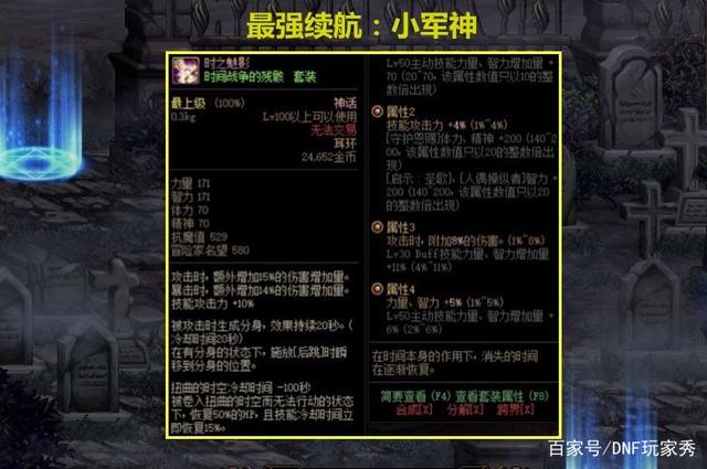 同样是改版成神的神话,被誉为“小军神”,强度仅比军神神话低一点,但是,没有速度限制,最重要的是,时间战争套装有减CD功效,被誉为最强续航神话,常规配装为“歧路+大恍惚+时间战争”。