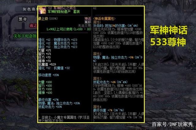 533搭配下最顶级的神话,被誉为“唯一5词条神话”,在保证了4个神话词条的基础上(+17%最终伤害,+15%三攻,+10%技攻;+4条专属属性),神话部位的普通词条,相比史诗耳环新增了“10%技能攻击力”,相当于5词条神话,一直被誉为533第一神话,唯一缺点就是需要速度,才能完美触发。