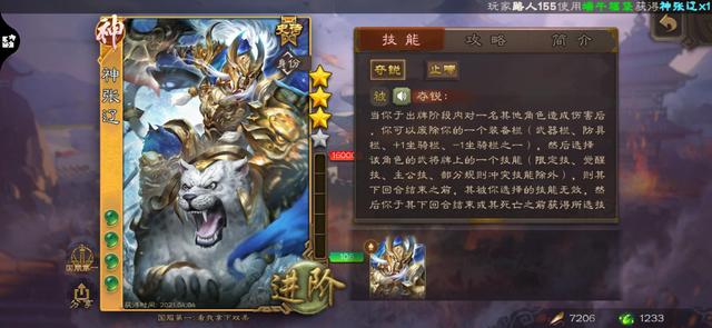 有朋友会说了,神张辽不就是一个白班么,就算作为主公也才五体力上限,这个体力上限并不能称为高。普通的神张辽确实也不强,就跟一个白班一样,技能只有一回合,很多回合开始的技能他都用不了。但是直到他遇见了杨彪加曹丕/满宠就不一样了,三个人在一块强度分分钟突破天际。