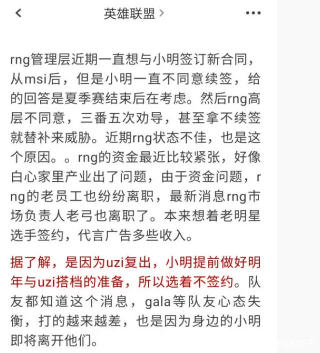 紧接着“抗吧”也有粉丝爆料RNG的小明为了和UZI重逢,甚至都拒绝了RNG的续约合同,这些爆料牵动着LPL粉丝的心,大家对此事也是越来越上心。