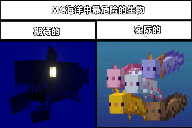 不过美西螈可不仅仅是可爱而已,他还有很强的攻击性,会主动攻击鱼类、鱿鱼类、溺尸、守卫者、远古守卫者,可以说是现在的海洋一霸。而这个海洋一霸的位置,以前玩家期待的可是Mojang加入鲨鱼。